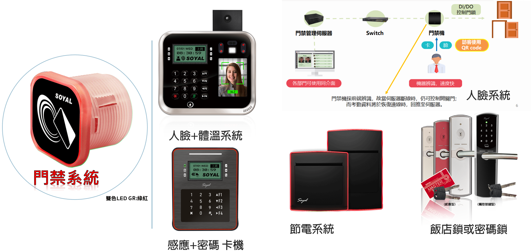 差勤系統用於管理員工出勤和工時的電腦軟體或系統。 它可以幫助企業輕鬆地追蹤員工的上班時間、休假、加班等情況, 以便進行工資計算、考勤管理和人力資源規劃等任務而門禁系統助於提升安全性、 管理效率和便利性應用範圍包含:企業辦公室、學校和大學、醫院和醫療機構、 公共場所、住宅小區、商場和購物中心、工廠和生產場所、運輸場所、酒店和旅館、會議和活動場所。